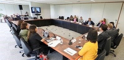 #DescriçãodaIamgem: A imagem mostra uma mesa de reunião com 11 pessoas, além das outras que estão na sala acompanhando.